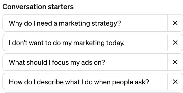 Now that we’ve got its instructions in there, we can add in “Conversation starters,” or those pre-written prompts you see when you land on ChatGPT: