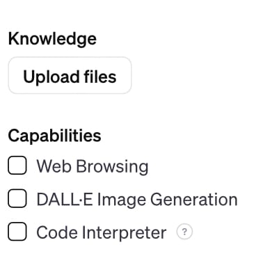 Below, you can give it capabilities, like Web Browsing, Image Generation, or Code Interpreter. I have these turned off for my Marketing Motivator to keep it simple, and I suggest keeping them off until you’re comfortable using and editing the bot. If you’re sharing the bot with others, its propensity to search the web or generate images at odd times may add unnecessary confusion.