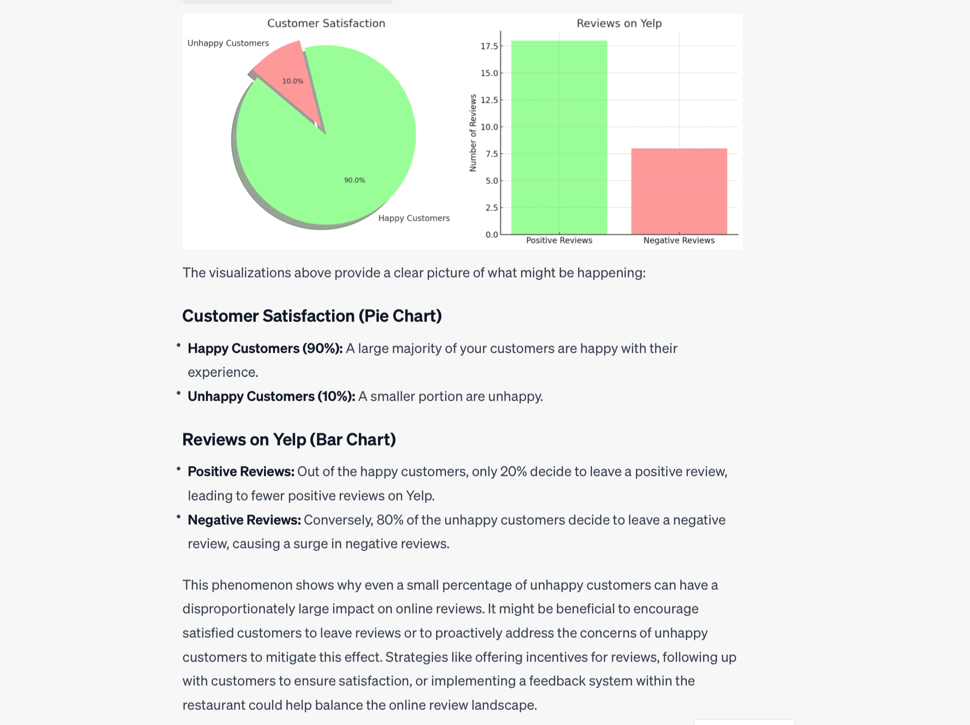 This phenomenon shows why even a small percentage of unhappy customers can have a disproportionately large impact on online reviews. It might be beneficial to encourage satisfied customers to leave reviews or to proactively address the concerns of unhappy customers to mitigate this effect. Strategies like offering incentives for reviews, following up with customers to ensure satisfaction, or implementing a feedback system within the restaurant could help balance the online review landscape.